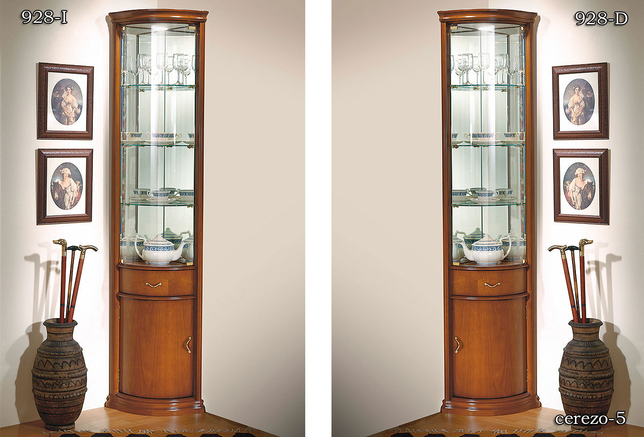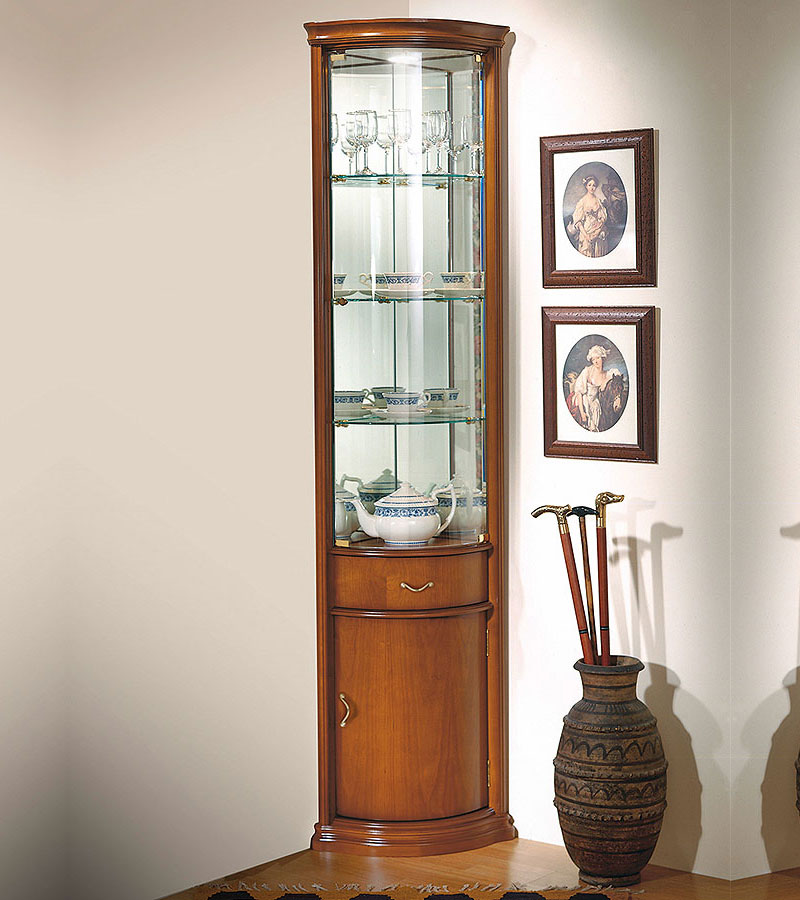 Угловая витрина Disemobel 928 cerezo-5 цвет вишня 1-но дверная, правое и левое исполнение, плоский цоколь, материал шпон вишни cerezo, массив бука производство мебельная фабрика Disemobel S.L., Испания