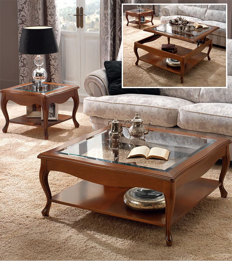 Журнальный стол Панамар 636.101 квадратный, приподнимающаяся стеклянная столешница, цвет шпон орех nogal, материал массив бука производство мебельная фабрика Panamar, Испания