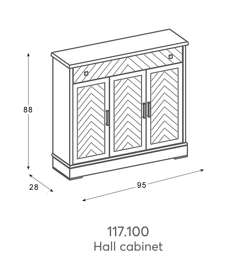 Три двери, четыре полки, один выдвижной ящик.