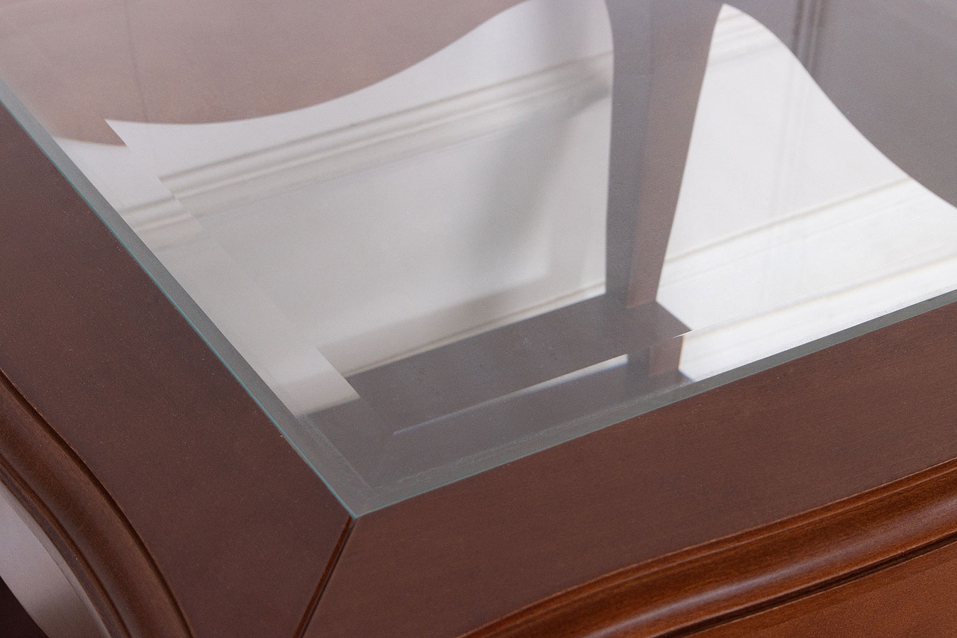 Стеклянная столешница с фацетом в деревянной раме.