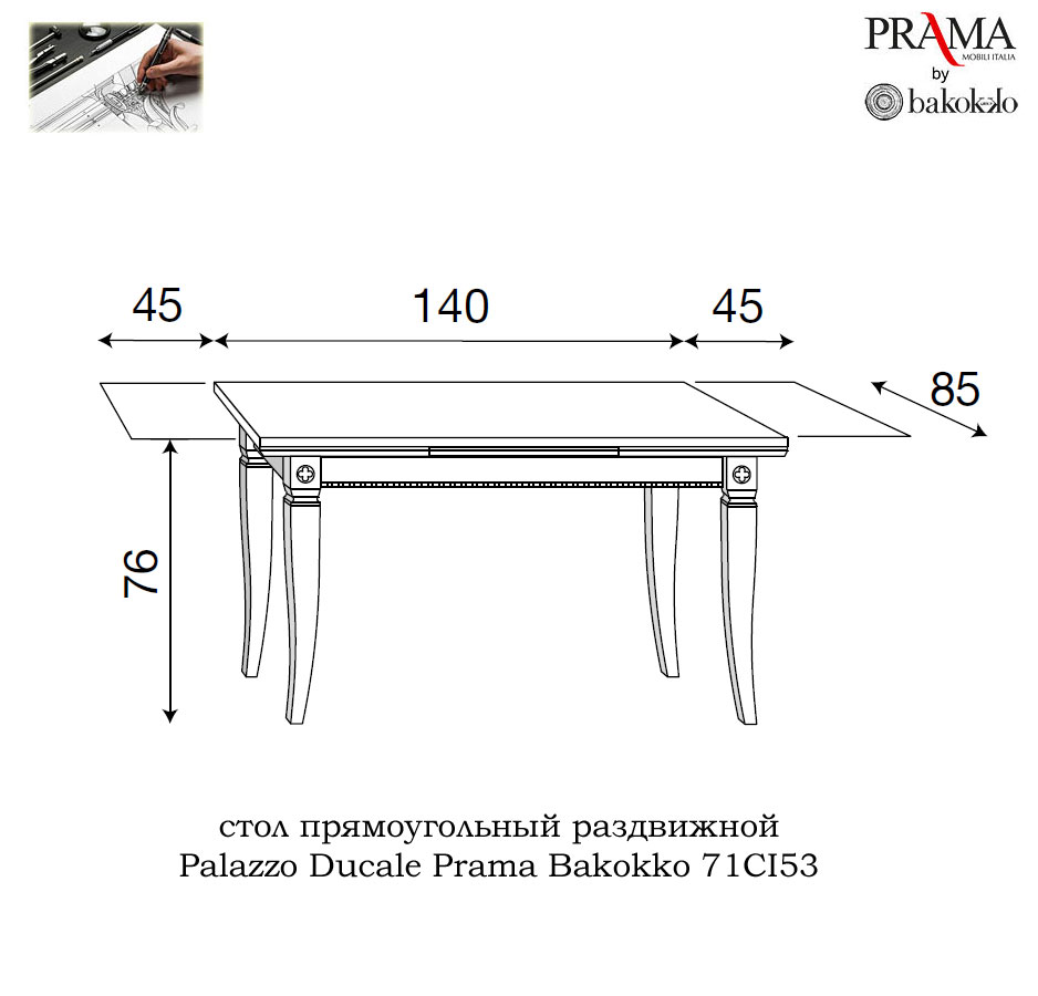 стандартная комплектация: Конструкция стол Palazzo Ducale Prama Bakokko 71CI53: цельная прямоугольная столешница, раскладывается за счет двух дополнительных вставок по 45 см по бокам; резные ножки из массива