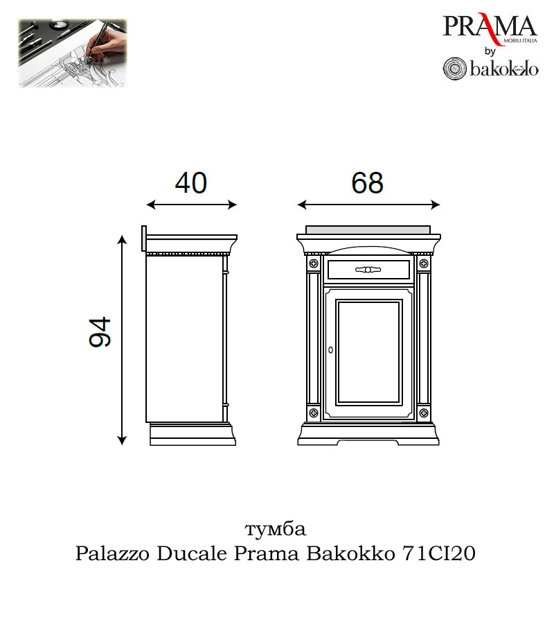 стандартная комплектация: Конструкция тумба Prama Bakokko 71CI20: один выдвижной ящик; одна деревянная дверь, закрывающаяся на ключ