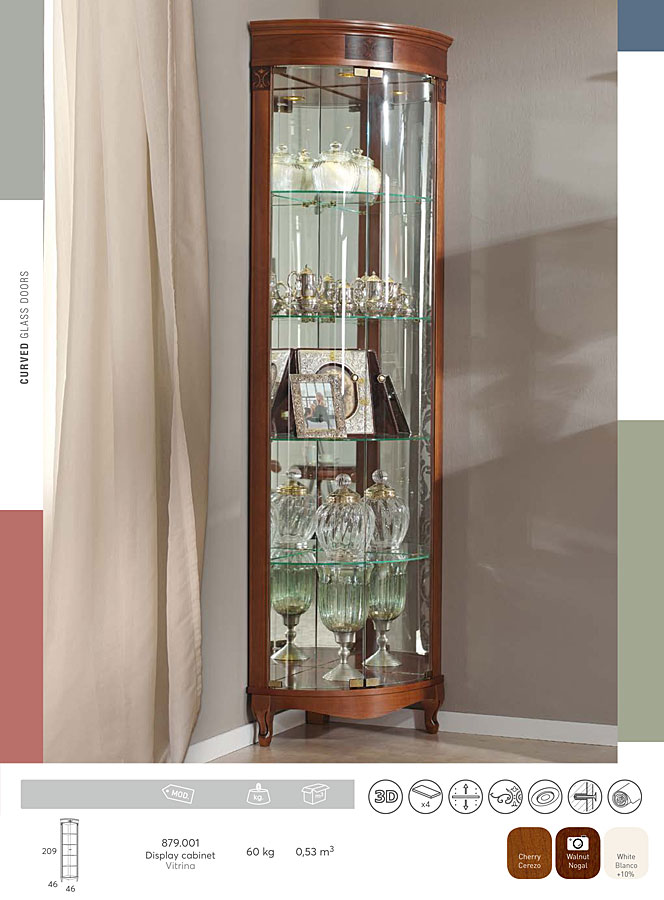 Угловая витрина Panamar 879.001 на ножках варианты цвета: шпон ореха nogal или шпон вишни cerezo материал мебельный щит из массива бука производство мебельная фабрика Panamar, Испания