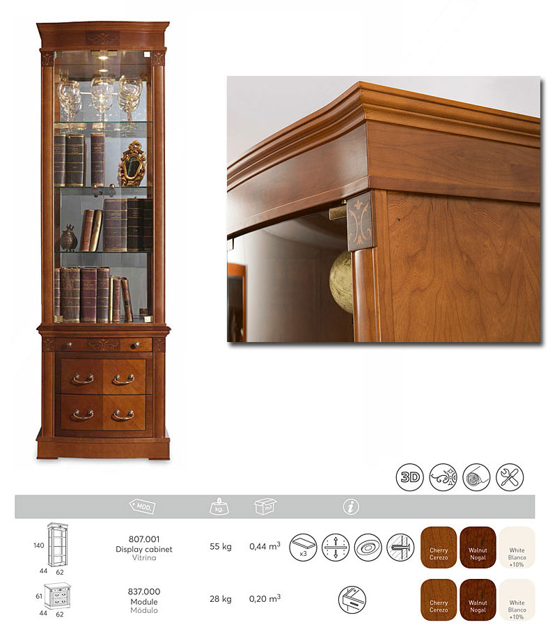 Витрина Panamar 807.001 + тумба Panamar 837.000 плоский цоколь варианты цвета: шпон ореха nogal или шпон вишни cerezo, материал мебельный щит из массива бука производство мебельная фабрика Panamar, Испания